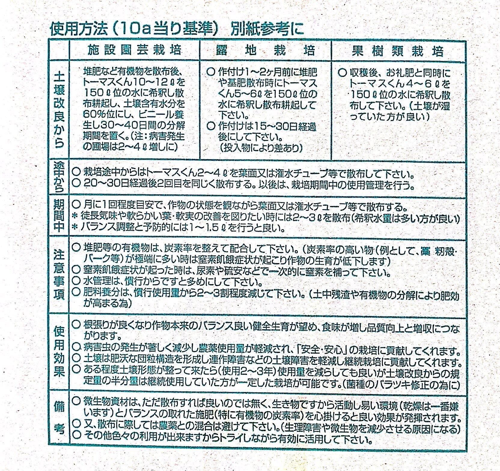 それ自体に肥料分はほとんどありませんが、有機物を高能率で分解する能力を持った微生物がぎっしり詰まっています。彼らを有効に働かせることによって、やせ細った土壌を肥沃な土壌に生まれ換わらせることが可能となります。